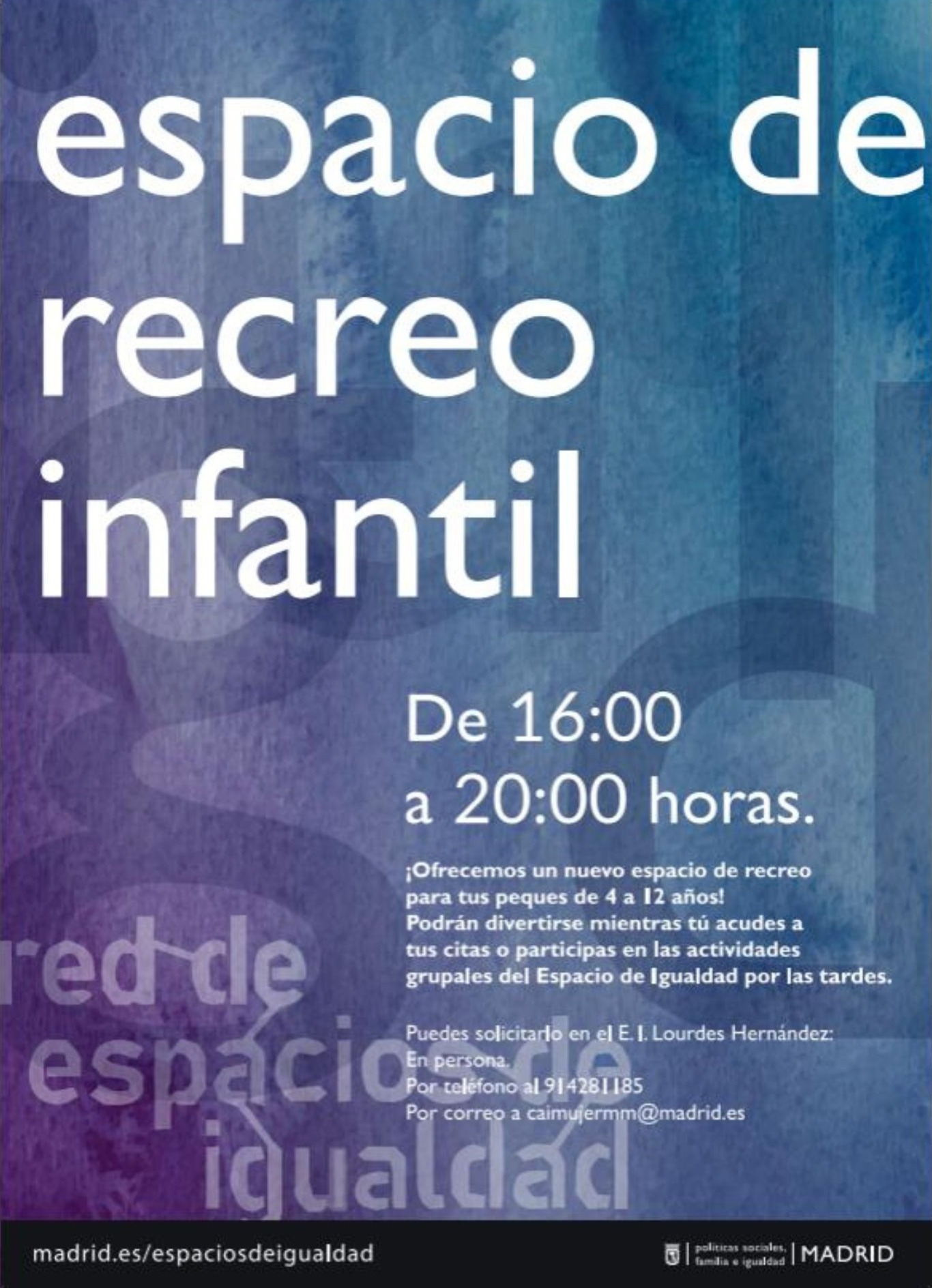 Desde el 5 de enero de 2026, el Espacio de Igualdad Lourdes Hernández ofrece un nuevo espacio de recreo infantil para tus peques de 4 a 12 años, en horario de 16 a 20 h. Podrán divertirse mientras accedes a tus citas o participas en las actividades grupales del Espacio por las tardes.