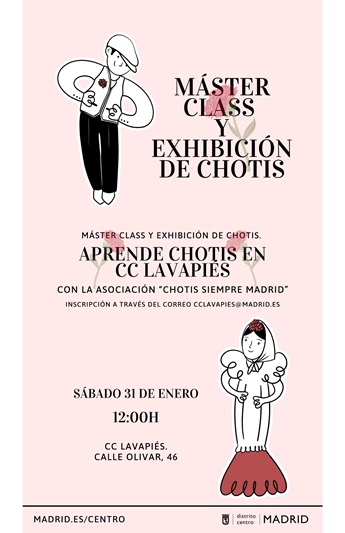Como cada último sábado de mes, tenemos chotis en el Centro Cultural de Lavapiés. Ya lo hicimos en el primer semestre, y vamos a seguir. El último sábado de cada mes te esperamos para aprender a bailar Chotis con la Asociación de Chotis Siempre Madrid, y al final disfrutaremos de una pequeña exhibición.